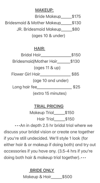 We have a 6-application minimum for most events to receive 1 artist. We can sometimes accommodate smaller bridal parties for an increased rate. If you book with 1 artist doing 6 or more services and then decrease your count at a later date, your rates could increase based on the minimum.